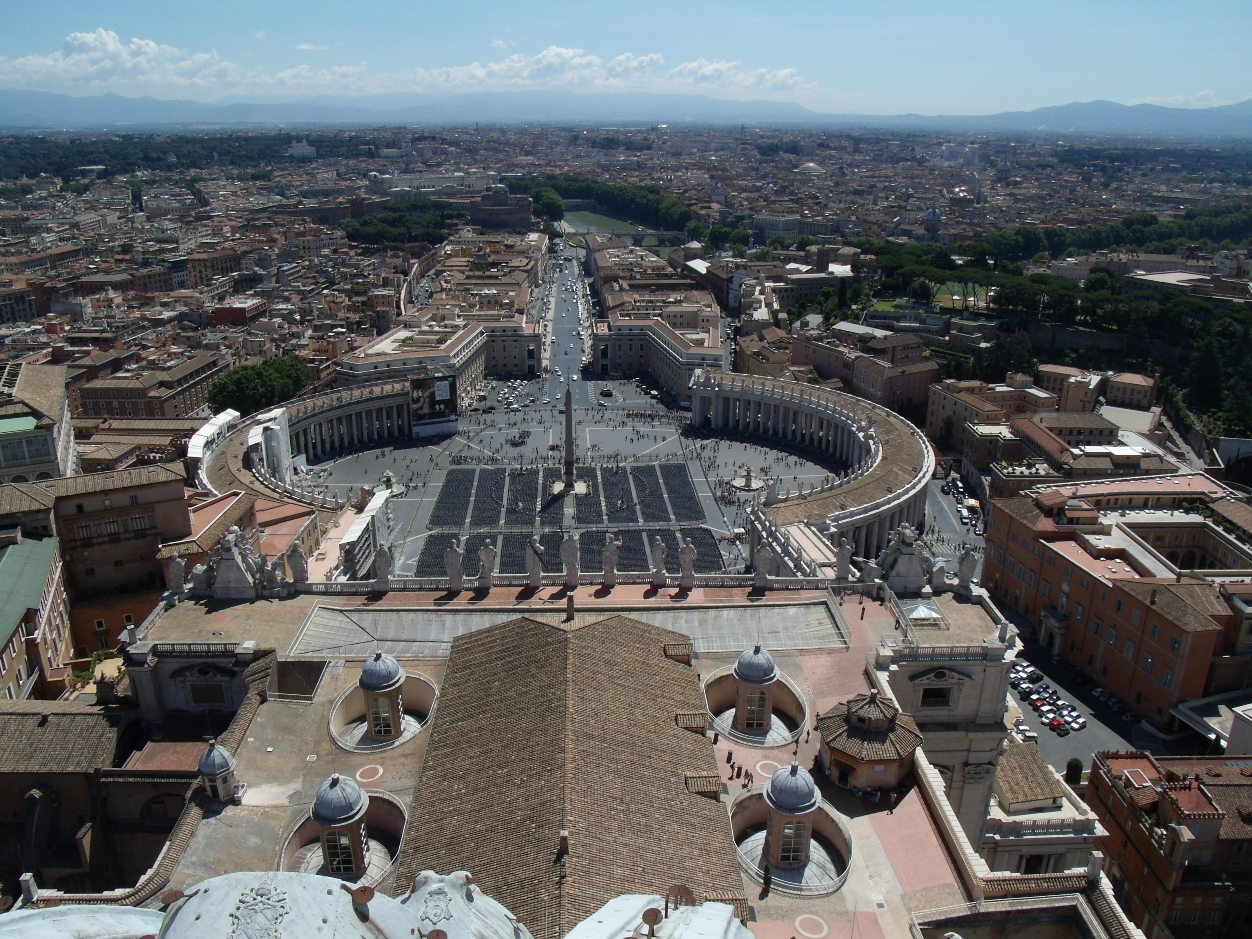 Пару слов о кемпинге. Кемпинг хорош тем, что он тенистый, имеет бассейн и развозку до пригородной электрички (на сайте обещали бесплатную развозку, но на деле пришлось платить 1Евро\чел\туда-назад в день). В кемпинге, как обычно, вручили карту Рима с достопримечательностями. Дальше у нас были 3 дня в Риме и 1 день (понедельник) потеряли (точнее – провели в бассейне и просто отдыхали в кемпинге). Как добираться до центра города – на развозке кемпинга за 1Евро едем пару км до станции электрички, покупаем за 1,5Евро билет на 100мин (позволяет по 1 разу проехать всеми видами городского транспорта), едем 30мин до конечной электрички – она же станция метро Оттавиано, пересаживаемся на метро по тому же билету – и через 15-20мин Вы в центре Рима. Дни в Риме распределили так: - музеи Ватикана + замок Св.Ангела; билеты в музеи Ватикана брал заранее на официальном сайте http://biglietteriamusei.vatican.va/musei/tickets/index.html, иначе станешь в хвост огромной очереди или нужно платить зазывалам «за экскурсию» в обход очереди; кому что - а мне в музеях Ватикана особенно запомнился зал карт, ну и, конечно, Сикстинская капелла; в замок Св.Ангела можно попасть без предварительной покупки билетов, в замке интересно послушать аудиогид (на русском) – интересна история превращения римской гробницы в замок; в этот день попасть в базилику Св.Петра не вышло из-за огромной очереди; - античный Рим (Колизей, Форум, Капитолийский холм, Пантеон); Колизей – понравился, Пантеон – восхитил! - базилика Св.Петра, вилла Боргезе; в базилику нужно попасть обязательно! Мы были в очереди в 09:00, уже в 10:00 очередь была в 2 раза длиннее – так что будьте пораньше; мы вошли в 10:30 – и провели в базилике в полном восхищении несколько часов, после чего еще полезли на купол – сам процесс «залазывания» интересен, ну а вид на Рим и Ватикан сверху - обалденный! Прощаясь с Римом, уже возле нашей пересадочной станции Оттавиано посетили виллу Боргезе – парк и музей; в музее было объявление, что билеты раскуплены на несколько дней вперед – но нам повезло, прямо перед нашим приходом была снята бронь и мы купили билеты; музей понравился. Один день (понедельник) – мы потеряли. История такая – вечером в воскресение было какое-то объявление по кемпингу, утром на ресепшене читаю «страйк общественного транспорта» - причем интересно так бастуют: с 08:00 до 17:00 и с 20:00 до упора; т.е. привезли римлян на работу и увезли с работы – а в остальное время бьют по туристической отрасли! Кемпинг давал до 08:00 развозку в режиме нон-стоп, чтобы вывезти всех желающих в город – но мы уже пролетели. На такие случаи у нас был План Б – в 30км от нас пригород Тиволи с виллами Адриана и д’Эсте. Но и там нас ждал облом – по понедельникам там выходной. Так что учтите. Пришлось затариться в супермаркете и устроить себе сытный ужин (вина в этот день, кажется, было 2 бутылки). В этот день мы встретили единственную во всех кемпингах еще одну (кроме нашей) украинскую машину – харьковская семья путешествовала на немолодом Пассате. Так что, народ, присоединяйтесь! Пробег 70км. Внизу - вид с купола базилики Св.Петра в направлении замка Св.Ангела (ну, вот как передать Рим одной фоткой?!).