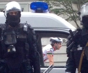 А почему у полицаев водитель в велосипедном шлеме и велоодежде? Приманивают геев?