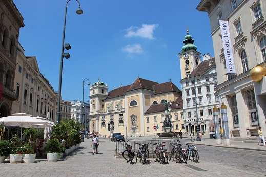 Позавтракав в отеле добротным шведским , входящим в стоимость отеля, часов в 8:30 выдвинулись на Вену. Туда дорогу прокладывал не по автобану, через маленькие австрийские городки по дороге №9. В первом же из них, Хайнбург-на-Дунае, заправились (1 литр 95го = 1,389 евро) и купили виньетку минимальную за 8,3 евро. Чуть потолкавшись в венских пробках ,около 10 прибыли к венскому собору Святого Стефана, где планировался подземный паркинг, и он даже был свободен, но! наш аппарат оказался велик для компактных европарковок по высоте. К этому я не был готов… и в срочном порядке пришлось наматывать круги по историческому центру. Все места вдоль дорог уже были заняты, а подходящий подземник нашелся лишь на границе старого города, у театра. Потратив на поиски около часа и оставив нашу машинку на 3 этаже под Веной , вышли на свет и тут возник вопрос: как же потом найти сие место? Повозившись со смартфоном и запеленговав пойнт, выдвинулись , наконец, на прогулку по центру.
