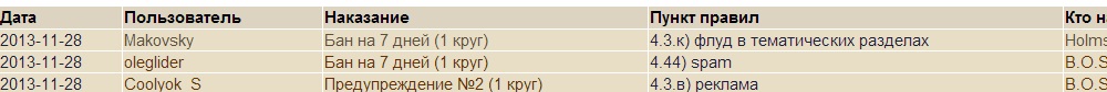 Но самое интересное это то что ХОЛМСом вынесено предупреждение-хорошо...БАН автоматом из за старых незаконных предупреждений...Тут как бы притензии к работе админа... Админ вышел на связь и удалил незаконный БАН... но тут продолжение...ХОЛМС видити ли посчитал что мне сидеть в БАНЕ и снова уже 28 числом выставляет мне предупреждение якобы за флуд...и ссылается на тему за которую я уже получил предупреждение... Система меня снова банит...и УСТИМ не выходит на связь и не решает проблемму...