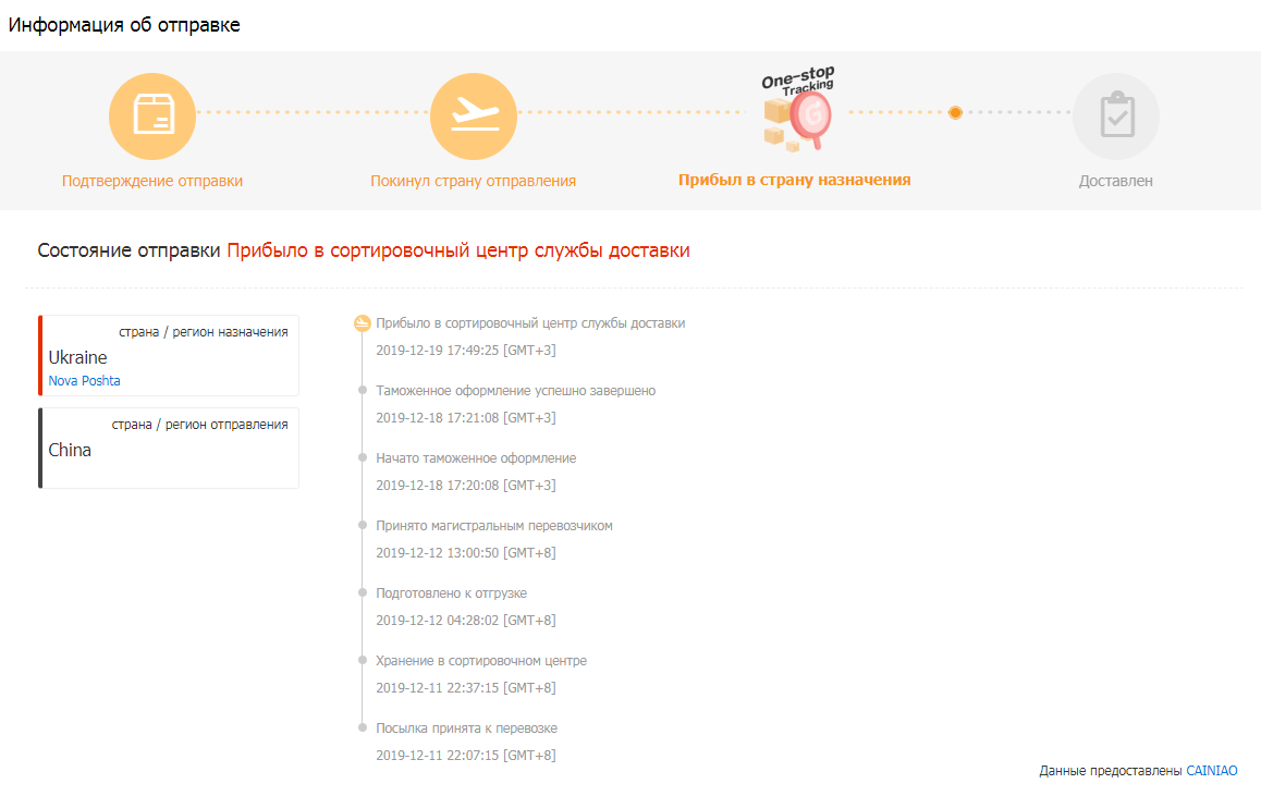 Відправка міжнародного відправлення з установи обміну країни подачі CNBJSA ТЕРМIНАЛ КИТАЙ 25.11.2019 15:34:00 Відправлення прийняте ТЕРМIНАЛ КИТАЙ 15.11.2019 10:22:00