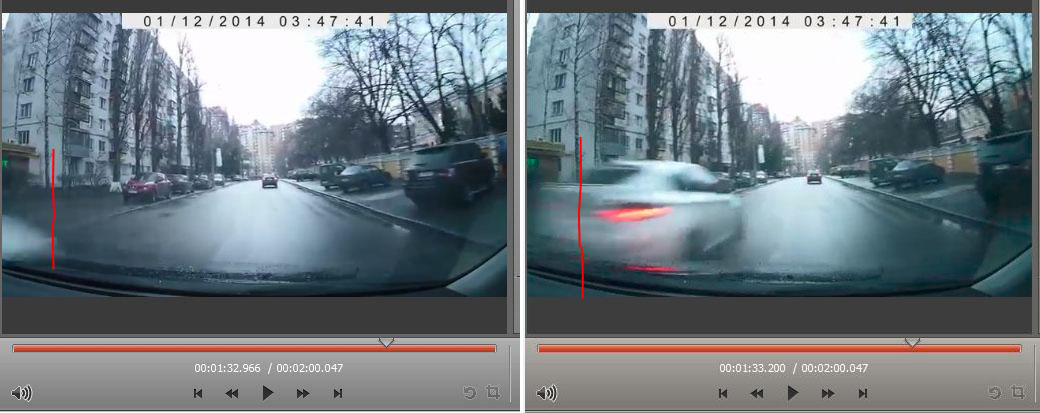 Прикинем скорость по видео. Длина Х6 по ТТХ 4.88м. По видео, почти весь (чуть меньше) БМВ проходит условную линию (красным цветом) за 234мс. Исходя из этих соображений, скорость не больше чем (поскольку, приняли во внимание длину не всего БМВ а чуть меньше) всего 75км/ч.