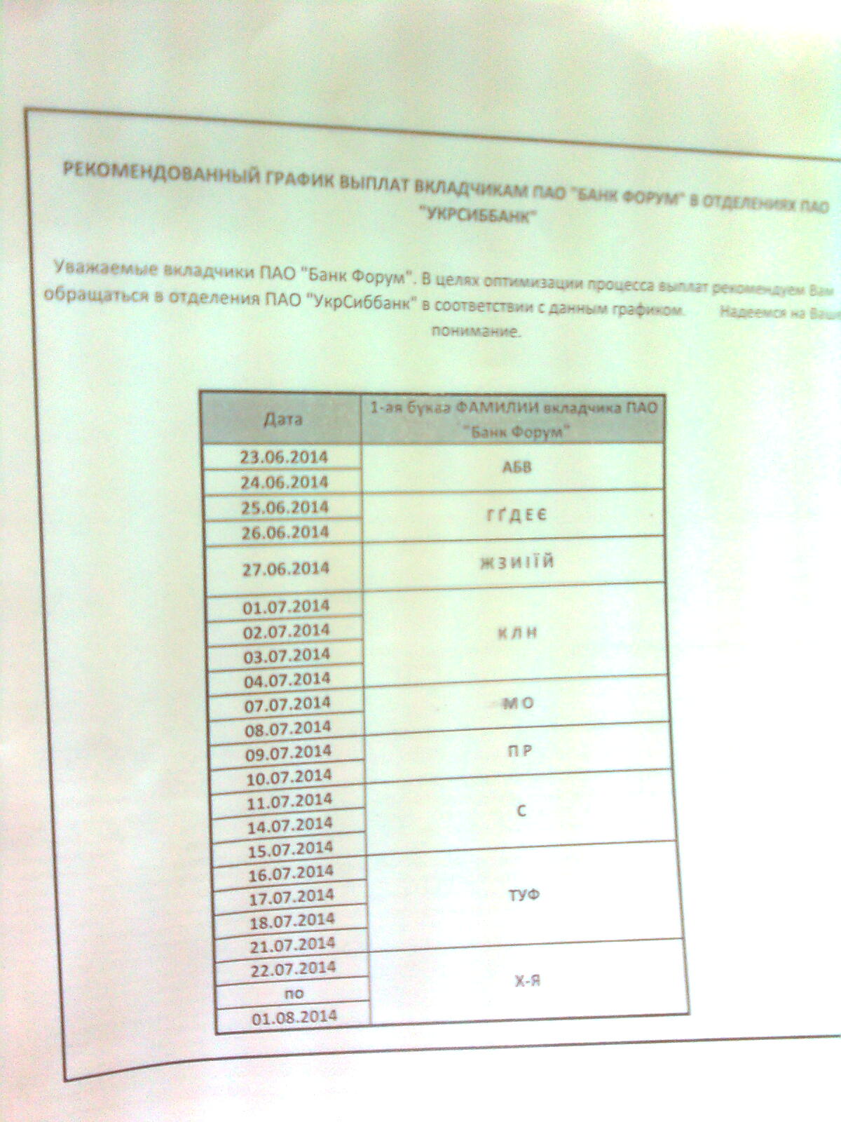 swap22 25.06.2014 21:41 пишет: Одни источники говорят что счет СПД подпадает под гарантирование вкладов, другие что нет. Сейчас укрсиббанк выдает деньги вкладчикам Форума. Правда, нужно зайти в любое отделение с паспортом и кодом и узнать что тебе причитается. Может и повезет. У самого РС и депозит, собираюсь в пятницу. Фамилия моя на З начинается.