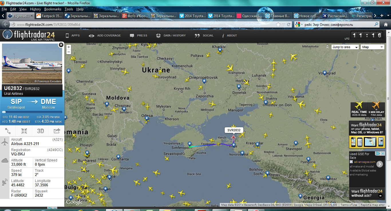 ну тогда рейс U62831 / SVR2831 Ural Airlines Москва - Симферополь наверное приведение Я не говорю уже про Аэрофротовские рейсы, которые также совершают регулярные полеты. Кстати и с Киева в Симферополь тоже летают регулярные рейсы Эир Оникс Canadair CL601 Challenger спокойно летит над территорией Крыма Так что с запретами полетов как бЭ не горячитесь )))) Война войной, а бабки врознь