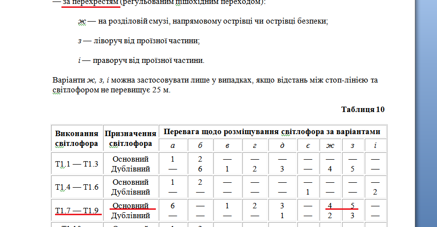 А табличку в этом пункте ты видел? Я ведь не зря указал данный тип светофора! Так вот, там ясно указано, что светофоры Т1.1 — Т1.3 в варианте п. і — праворуч від проїзної частини - не применяется! Может применятся только в вариантах ж — на розділовій смузі, напрямовому острівці чи острівці безпеки; и з — ліворуч від проїзної частини; - в качестве дублирующего, но никак не в качестве основного!