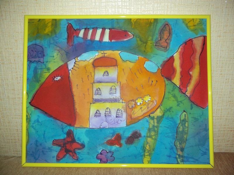 Катя, 8 років. Батик (розпис по тканині за допомогою воску та барвників). "Пасхальна рибка".