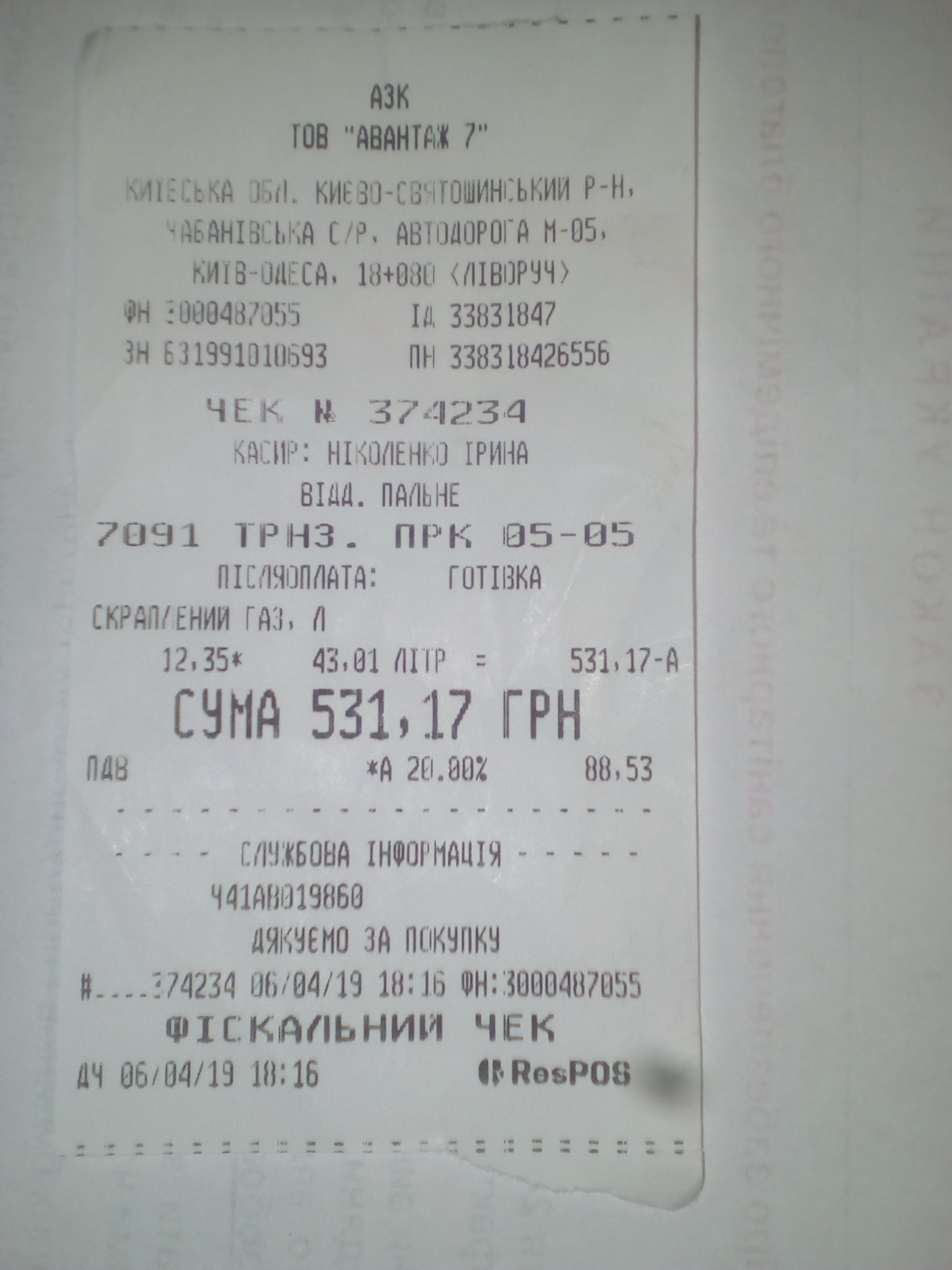 Подробности: новая заправка Avantage 7 на Одесской трассе, перед Чабанами, по направлению в Киев, колонка №5. Месяц назад на этой же заправке, но колонка точно была другая (ближе к трассе), налили нормально (около 39 л., точно не припомню), в Жулянах (путепровод) год заправлялся нормально, а тут такое жесткое на...лово