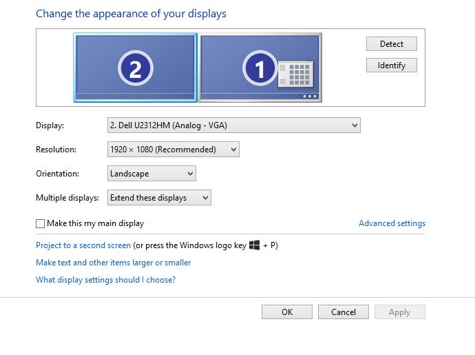 Нажми Win + P или Fn и кнопочку с телевизорами. И там повыбирай варианты подключения мониторов.