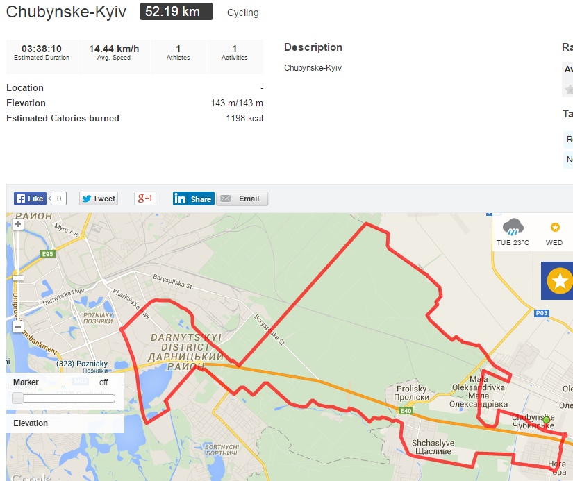 А я как-то решил не возвращатсья к железке, а через Княжичи выехал на Броварское шоссе. Итого 43 км где-то (правда стартовал и вернулся на Днепровскую набережную).