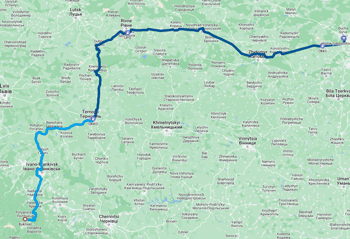 Їздив 11 вересня туди, 17 вересня назад Їхав Київ - Житомир - Рівне - Дубно - Кременець (об'їзна)- Тернопіль - Рогатин(об'їзна) - Бурштин - Івано-Франківськ(об'їзна) - Надвірна - Яремче - Буковель