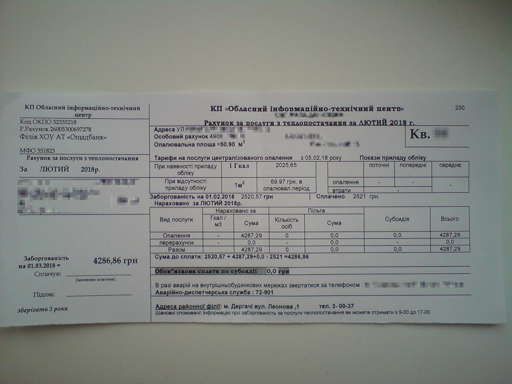 вот платежка за обычную советскую квартиру, хрущевка 50 квадратных метров, стоимость в месяц 4300 грн.