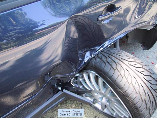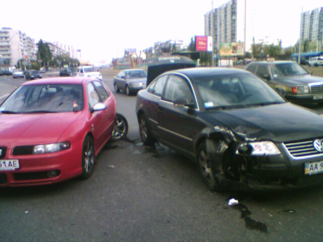 Стоял пася у бордюра никого не трогал. Несся ГонсЧик. По касательной цепляет пассю и упирается в колесо, при этом полностью его вывернул. Колесо сыграло роль демпфера.