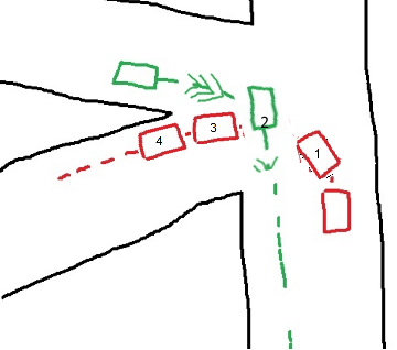 А если зеленый доехал до точки 2 и увидел красный авто, приближающийся справа - опиши действия зеленого, плиз