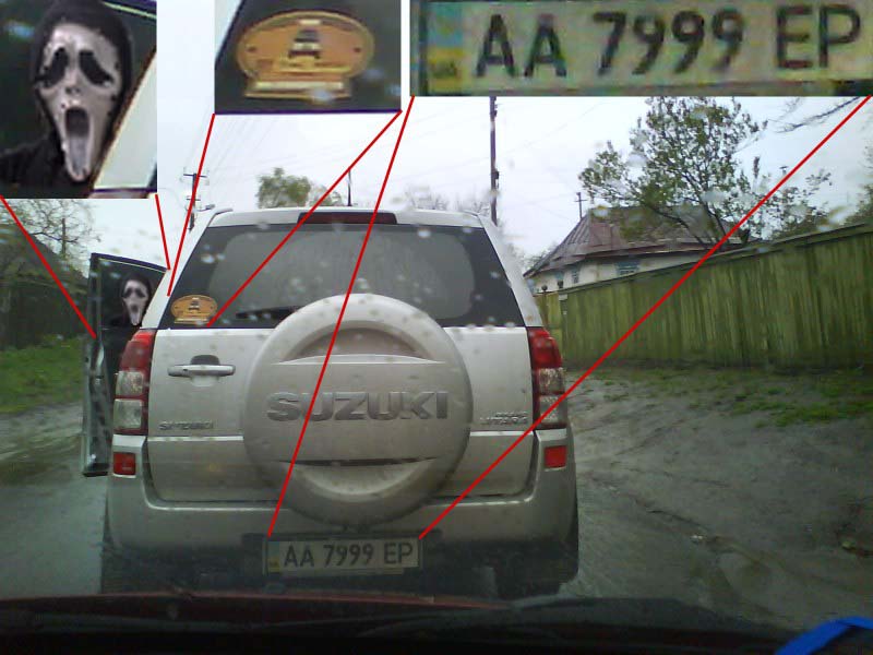 Я попросив Олену ####, яка весь час знаходилась зі мною у машині на правому передньому місці, зробити телефоном фотографію Suzuki, на якій би було гарно видно державні номери автомобіля. Для цього я рухався на невеликій відстані від автомобіля Suzuki, утримуючи безпечну дистанцію з т.з. Правил Дорожнього Руху. Коли ми проїжджали будинок №122 по вул. Шевченка, водій Suzuki знову різко загальмував до повної зупинки та вискочив з машини – цей момент засвідчено на фотографії (копія додається), час знімку: 9:59.