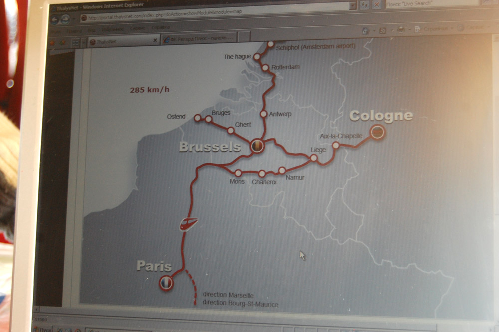 в поезде Thalys можно смотреть по карте где находишься и наблюдать за скоростью. Временами она было и 300 км/ч