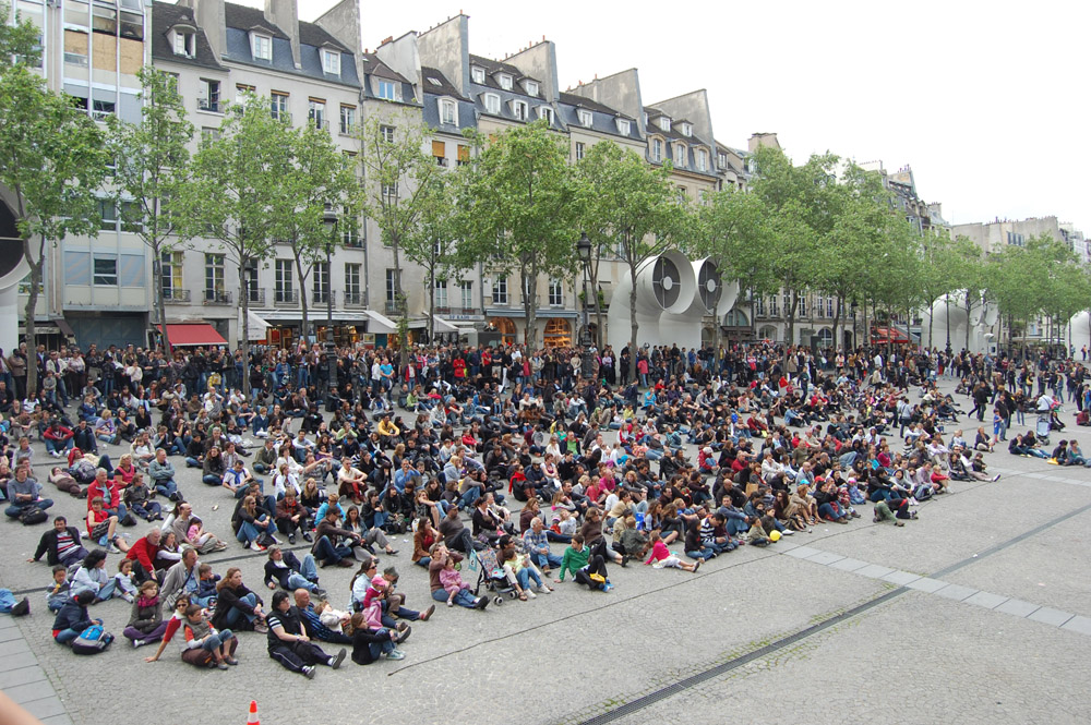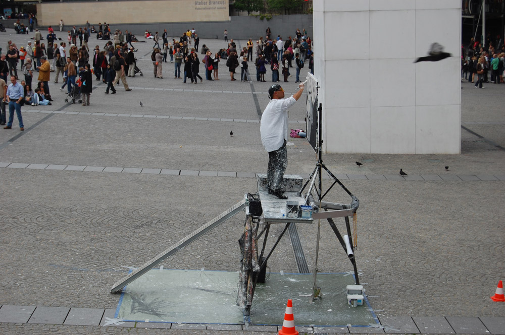 а это уже центр Помпиду. Некий художник рисует американского президента верх ногами