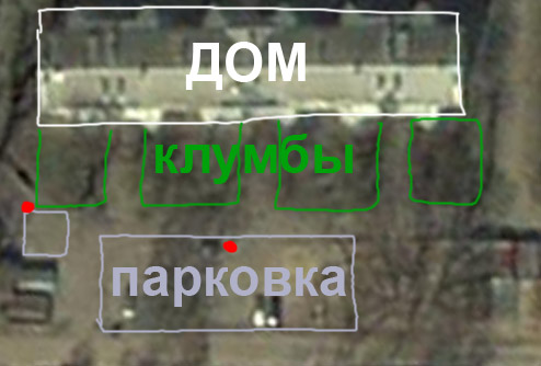 Дело в том, что дом отделен от парковки клумбой, на которой растут деревья. А вот столбы (красные точки на картинке) - как раз отлично подходят, чтобы установить на них три галогенки (одну слева, две на центральный стоб).