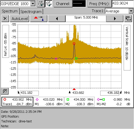 Уточните место замера, пжлст. Ибо в киоске на углу (перед самым шиномонтажем) стоит сигнализация. Точно знаю, что "засирала" 434,325. Очень сильный уровень сигнала в самом киоске. Могла уйти её частота. Распогодится - схожу проверю.