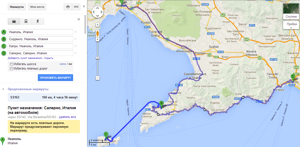 На карте получается примерно вот так (нарисовал от Неаполя, чтобы наглядней на карте было видно, что где): из Сорренто есть прямая переправа на Капри; но островок настолько мал, что тянуть туда машину совершенно бессмысленно - только лишняя морока. От Неаполя советую ехать до Помпей по автостраде А3, потому что скорость передвижения по местным дорогам - 20-30 км/ч; на автостраде тоже бардак: недавно расширили до 3 полос, но новую разметку не нарисовали, все ездят, как по полю - но хоть быстрее будет.