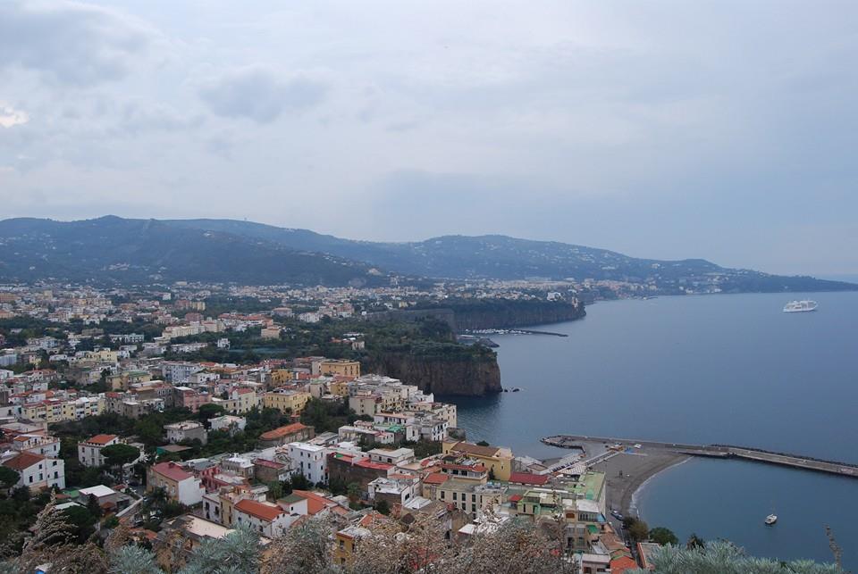За два часа дорулил до Неаполя, потом ещё минут 15 до Помпей - и почти час, то и дело останавливаясь (пока рейсовый автобус где-то далеко впереди колонны машин высадит пассажиров на остановке) тянулись до Сорренто. Места красивые - строиться можно на узкой полоске суши между скалистыми горами и морем; вид на Соррентийский полуостров с вершины Везувия: