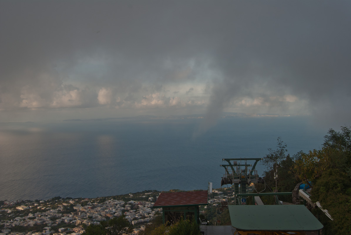 За завтраком мы замешкались, потому опоздали на обычный паром местных линий КаРеМар (Кампанейские Региональные Марские) - около 13Е за переправу; пришлось плыть более пафосным реактивным катером - там берут уже 18Е, он идёт быстрее, то 20 минут на борту против 30 как-то не очень существенны, согласитесь. Ещё на подходе нас накрыл дождь - очень забавный был момент входа в практически вертикальную стену капель: сзади - светло, впереди - темно и мокро