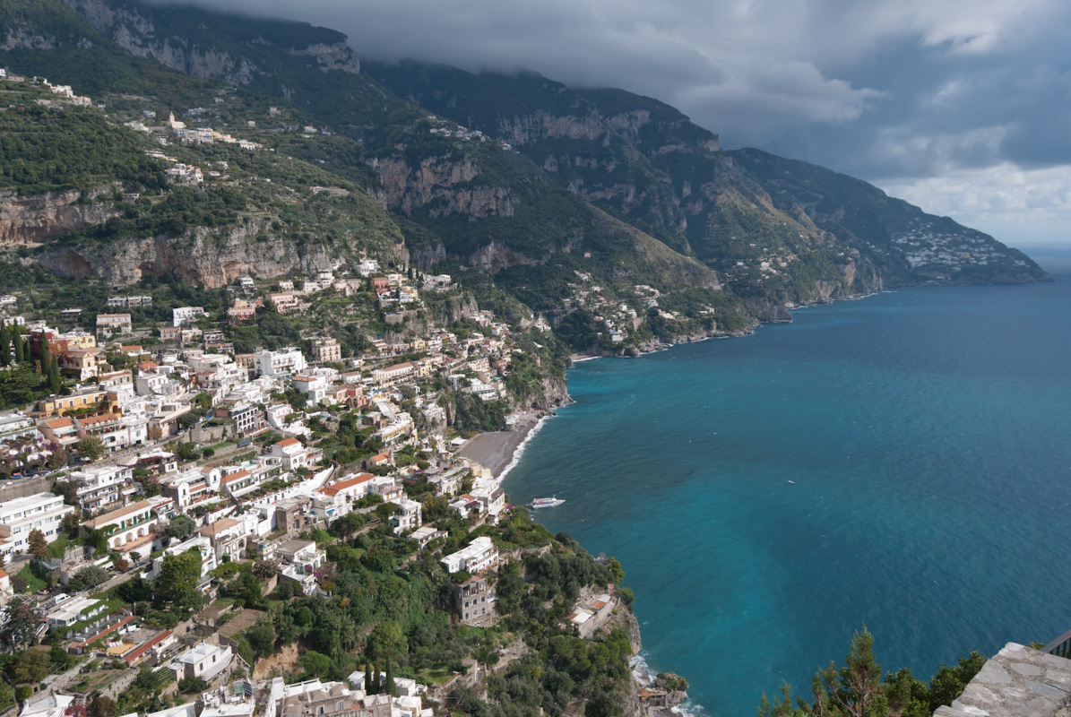 С другой стороны, тут автодорога - единственный вариант для перемещения, причём дорога очень узкая - две легковушки разъезжаются с трудом (соответственно, в узких местах приходится тормозить в ноль при каждом встречном), встречные автобусы расходятся буквально в милиметрах. Возможно, на мотоцикле там веселей ездить - мотоциклистов там множество, как на спортах, так и на чопперах - но на машине тупо страшно: ОЧЕНЬ узко. Я очень рассчитывал погонять там - не вышло, вместо этого средняя скорость 20 км/ч, периодические остановки на обзорных площадках для фотографирования окрестностей и замедления до скорости "шагом" чтобы разминуться со встречными. Зато там красиво, невероятно просто (завидуйте те, кто летом фотографировал ясное голубое небо и не видел дальше 2 км из-за дымки в жару) Вот вид на Позитано, один из более крупных городков - он размещён в естественной бухте в виде амфитеатра гигантского театра природы (более-менее горизонтальная черта на склоне гор - на этом и других фото - это та самая автомобильная дорога SS163):