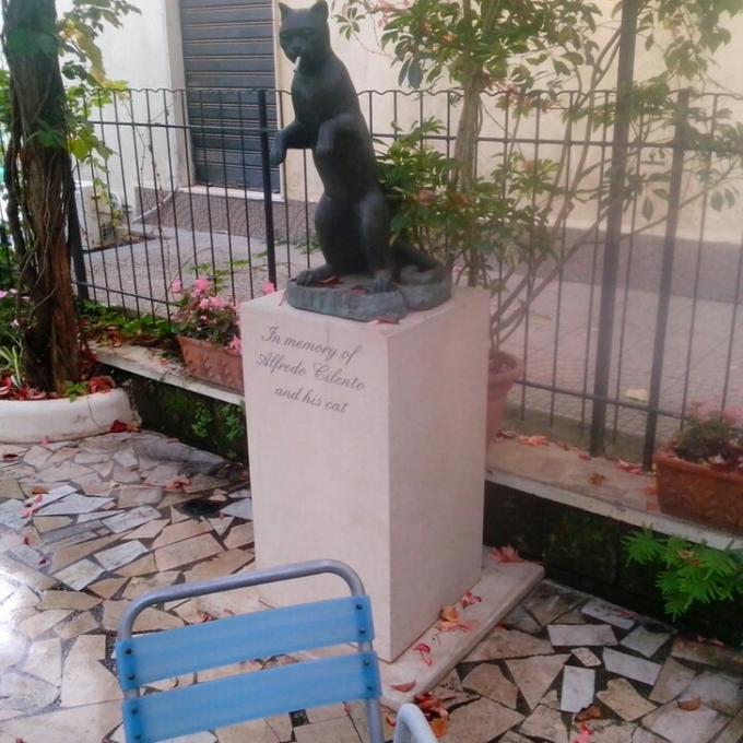 Дальше дорога идёт через городок с поэтическим названием Сант-Агата суй Дуе Гольфи - в смысле, Св. Агата на двух заливах; после проезда этого городка будут смотровые площадки, с которых открываются виды на обе стороны Соррентийского полуострова, на заливы имени Неаполя и Салерно (откуда и произошло название). Но самый прикол мы случайно обнаружили в центре этого городка - остановились там на завтрак. Площадку перед баром Орландо украшает скульптура кота... с сигаретой в пасти! Как нам рассказала хозяйка, их кот (почивший уже в бозе вслед за хозяином) как-то научился брать сигареты в пасть и держать их - чем изрядно веселил местную публику: