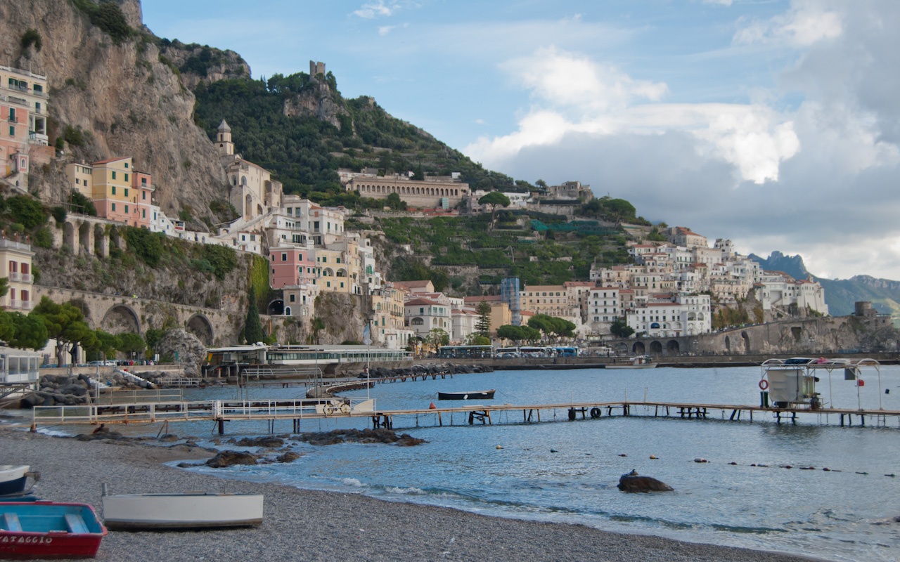 Подожди! - скажете вы - мы где-то уже это видели! - и будете правы, "горы спускаются в море" - это же про Чинкветерре (про которое знает каждый русскоязычный турист в Италии). Очень похоже, с небольшими отличиями: в Чинкветерре удивительно тесно (всего пять деревушек-городков), плюс есть характерные террасы, на которых выращивают виноград и оливки; а ещё там есть ж/д сообщение - практически, в каждой деревушке. Зато на Амальфи просторней (сами городки такие же тесные - но по количеству их больше), теплее (вместо +30С будет +35С ) больше южных фруктов - в первую очередь, лимонов и прочих цитрусовых - и местная керамика (из которой здесь делается не только 80% сувениров, но и вообще всё подряд, вплоть до лавочек на улицах)
