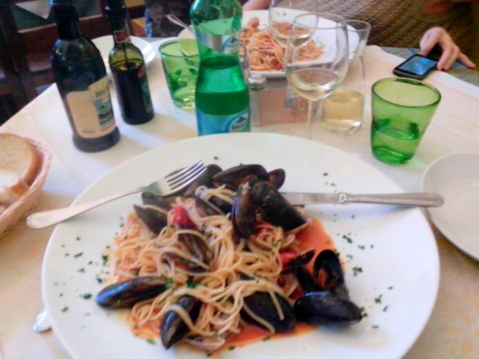 На месте, пока покрутились по узким улицам в поисках места для парковки, приметили ресторан для обеда: Лукуллов пир (по имени одного из консулов Древнего Рима, который прославился изысканностью кухни на празднованиях для римской знати, вплоть до соловьиных язычков) - оказалось, превосходное место! размер порций такой, что можно смело заказать одно меню на двоих, если мало - плюс ещё одно первое блюдо (паста), плюс вино - 30Е на двоих - и КАК там кормят! Естественно, выбирали с уклоном в свежую рыбу и морепродукты: