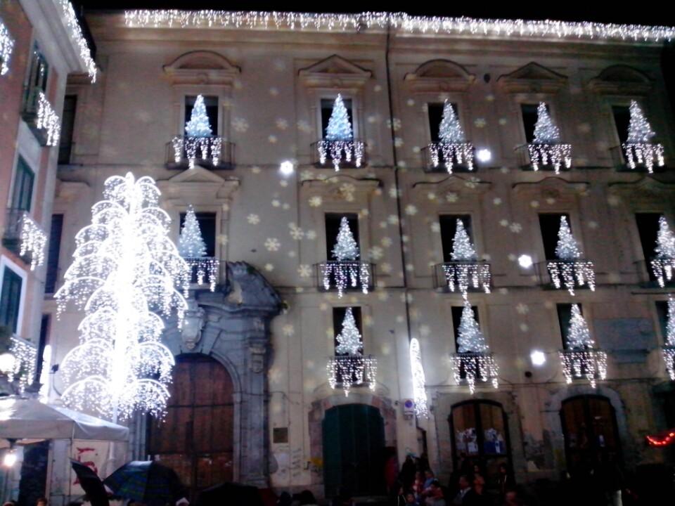 Весь центр Салерно - а он достаточно немаленький, город на 150 тыс. жителей - украшен гирляднами и праздничными украшениями, всё это не просто светится разными цветами - но ещё блестит, переливается, много где установлены движущиеся световые инсталляции: падающие звёзды или "идущий" снег, спроецированный на стену здания: