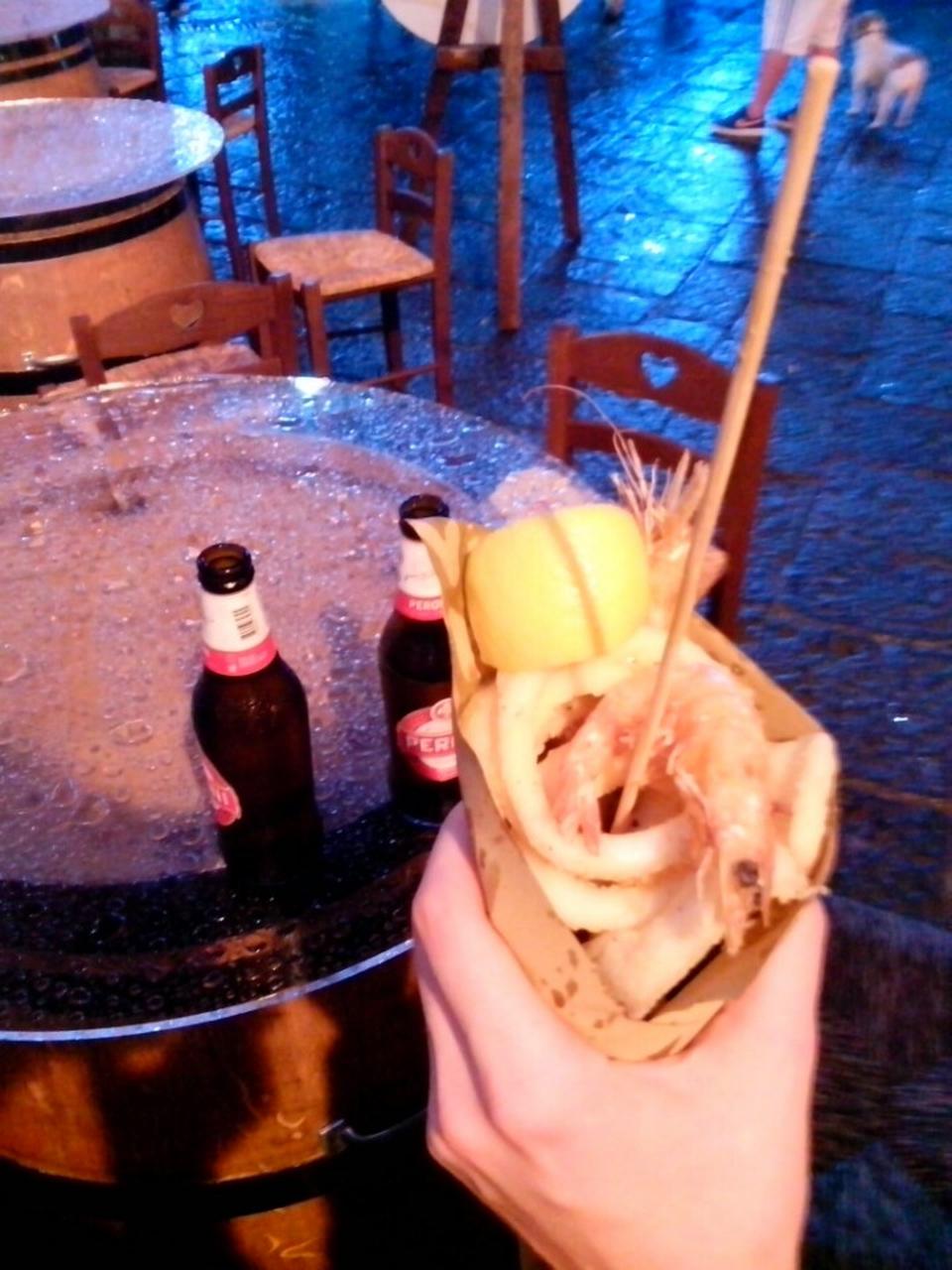 Однако же, в Салерно освещённые променады сменяются старыми трущобами настолько плавно, что поначалу я этого даже не заметил - количество света и укращений не уменьшилось, так же как количество гуляющих вокруг нас. Улочки стали узкими, а пафосные рестораны, кафе и магазины сменились забегаловками с различными национальными кухнями: кроме итальянской навалом арабской, греческой и палестинской (портовый город, опять таки) Пахнет из этих забегаловок замечательно, цены - закачаешься! Вот этот пакет свежеобжаренных морепродуктов - 3Е:
