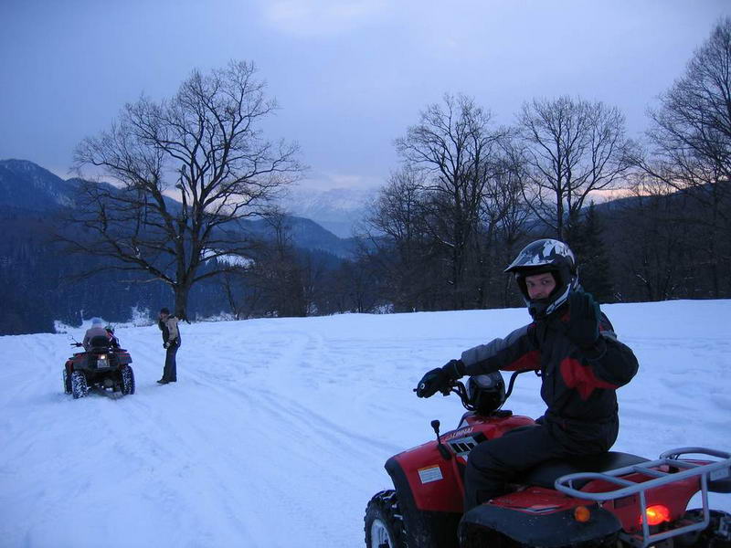 Кроме катания на лыжах, в Пояне также можно покататься и на коньках на открытом катке (размером в хокейное поле, находится возле отеля Олимпик). Некоторые из нашей компании пробовали, понравилось, стоит не дорого (около $3 оренда коньков и столько же вход на сам каток на полтора часа, работает до 10.00 вечера). Также можно покататься на квадроциклах ($50 в час) или снегоходах ($65 в час), я попробовал на квадроцикле (см.фото), часа вполне хватило, тоже понравилось... хотя помню что год назад, когда катались на снегоходах в Лапландии, то понравилось еще больше Также из "апре-ски" развлечений можна посоветовать выезд из Пояны для осмотра крепости в Рышнове (она совсем рядом, около 10км), и в том же направлении чуток дальше (25-30км) - замок в Бране (тот который на многих картинках показуют как Замок Дракулы)... съездили мы в оба, в Рышнове я был впервой, крепость стоит на высоком холме, посему открываются с нее красивые виды на всю окрестность и горы. В Бране я уже был в 3-й раз (из новинок - во всех комнатах теперь мини-камеры, посему тяжелее "подпольно" сфотографироваться)... наибольше в Бране мне нравится базарчик возле Замка, где наилучший шоппинг сувениров наверное во всей Румынии В вечер того же дня мы из Брана заехали еще в Брашов, погуляли центром (как никак самый красивый город из всех крупных областных городов в Румынии), опять опоздали по времени для посещения Черной Церкви (нужно успевать до 15.30)... по совету местного мужичка (в книжном магазине поспрашали) зашли поужинать в приятный ресторанчик Бэлла-Музика (он практически на центровой площади - напротив местного офиса банка RZB), еда и обслуживание очень понравились, также посетителям можно заказывать музыку (жаль не живую) .. цены ниже киевских раза в 2... После ресторана решили добавить шоппинг-ощущений и поехали во французский супермаркет Керфур (он на выезде из Брашова, если ехать на Бухарест, работет до 10.00 вечера в будние дни), там же рядом есть и другие большие торговые центры - Метро, Сэлгрос. Керфур хорош тем, что кроме стандартного набора "а-ля Метро", здесь можно купить карты и путеводители на английском... я взял себе путеводитель Лонли-Пленет сборник по всей Восточной Европе включая Украину - потом было интересно воспользоваться советами этого путеводителя в наших Черновцах!.. стоило это дело порядка 180грн.
