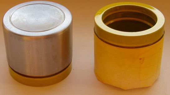 Вот как раз 2 поршня: тот, что справа - я забраковал по причине задира (задир виден). тот, что слева - нормальный (наружную поверхность защищал скотчем от царапин сразу при разборке суппорта).