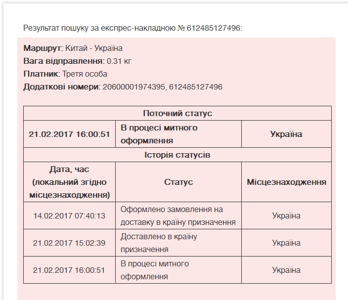 12.02.2017 07:54:31 - Оформлено замовлення на доставку в країну призначення - Україна - Київ 17.02.2017 13:40:00 - Доставлено в країну призначення - Україна 20.02.2017 12:30:00 - Доставлено на митний термінал - Україна 20.02.2017 13:00:00 - В процесі митного оформлення - Україна 21.02.2017 10:52:54 - В процесі митного оформлення - Україна.