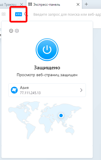 В опері, зліва біля адресної строки є значок впн (з
