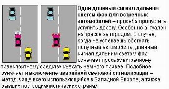 ...томобилей – просьба пропустить, уступить дорогу. Особенно актуален на трассе за городом. В случае, когда не успеваешь обогнать попутный автомобиль, длинный сигнал дальним светом фар означает просьбу встречному транспортному средству съехать немного правее. Подобное означает и включение аварийной световой сигнализации – метод, чаще всего использующийся в Западной Европе, а также бывших постсоциалистических странах.Это дополнение из "Автоцентра". Там,только,зарегистрироваться надо,чтоб архив читать.