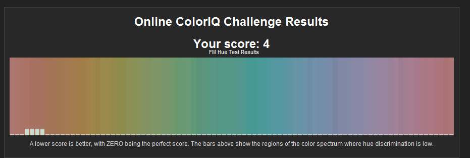 Да ну на фиг...Еще и на время...Вот более прикольный на цветовосприятие без гонок... http://www.xrite.com/custom_page.aspx?PageID=77 Выставить по порядку квадраты от одного цвета к другому,чем ниже результат тем лучше...У мну 4