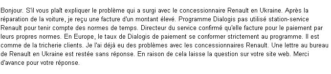 лучше бы по-английски, но правильно. Небольшой текст могу проверить/перевести. Вот ещё тут формочка есть - http://group.renault.com/en/contact-us/, вроде это больше подходит, т.к. renault.fr для французских клиентов.