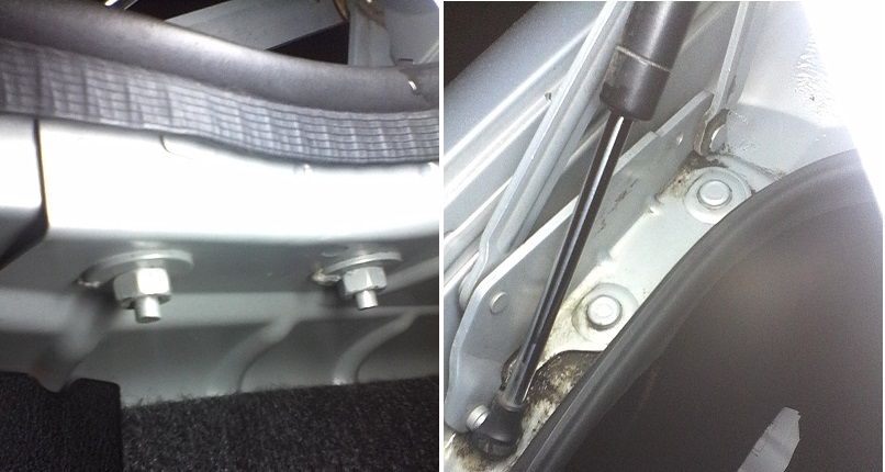 С завода был герметик, но только вокруг самих болтов. Под самой петлей где-то по центру - места точечной сварки, толком не обработанные. В одном месте коррозия сделала свое дело, отсюда и как-кап. Герметик напихал от души, теперь пусть только попробует. Да, прорези в желобе квадратные, и довольно большие. Вроде и попали по меткам, но с зазорами все равно пришлось поиграться.