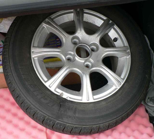 Это после истории с люком. На Краснозвездном был, вердикт - 300 грн... Диск новый купил за 270. Но этот все таки выкидывать жалко, мож можно гдето дешевле заварить "укус" и прокатать восьмерку? А шина с такой дырой лечится?