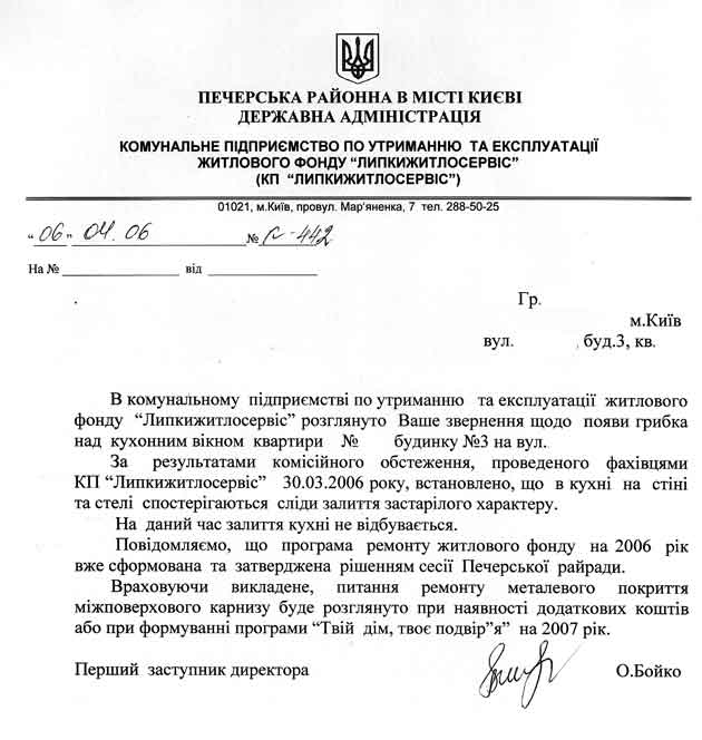 Дома на кухне сквозь стену, когда активно таял снег, протекла вода. В итоге имеем пятно на пол кухни характерного вида и цвета. Было написано заявление в ЖЭК. Пришли оттуда тетки посмотрели и сказали что таки да, течет наша стена будем что-то решать. Спустя недельку-другую получаем следующее письмо.