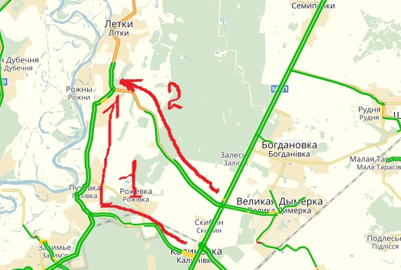 Это вариант №2 Вариант №1 точно не стоит- он самый длинный и убитый. Для тех кто через Троещину все понятно, а для тех, кто через Лисову самый лучший за птицефабрикой на светофоре налево и в Зазимье направо и пошли -Пуховка-Рожны- Летки