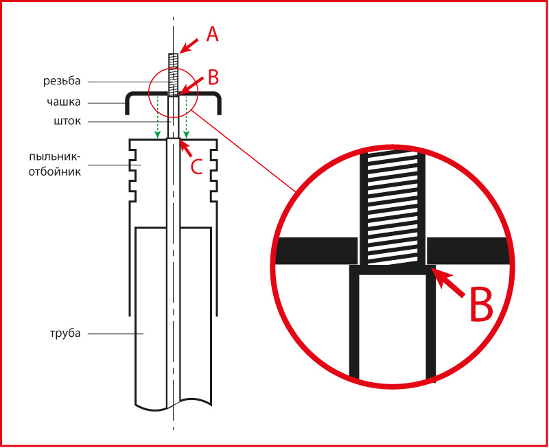 Вот дико жалею, что не сделал фото, если во вторник этот экземпляр еще будет в магазине - таки сниму и выложу. Там поверхность штока на участке BC не ровная и гладкая, как ниже, а вся в неглубоких канавках-дорожках, как будто чем-то обрабатывалась, но грубо, начерно. И чашка на пыльник не садится, а если пыльник поднять, то он сверху болтается, т.к. шток там тоньше, а снизу до трубы не достает. Так что все-таки брак. И да, на самом аморте выбита маркировка правильная, а не только на упаковке.