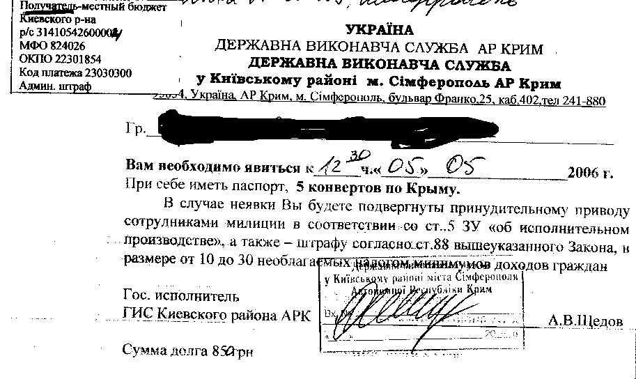 Принесли сегодня странную бумажку мне. Сунули прямо в руки, сказали что обязательно надо явиться завтра утром в суд(?) и убежали. Ни подписи не взяли ни обхяснений никаких больше не взяли. Бумажка оказалась из исполнительной службы, так что при чем тут суд - непонятно. К бумажке прикреплены степлером реквизиты, у штрафа нолик пририсован от руки. (на скане по идее видно). (5 конвертов по Крыму? Эт что за нововведение? ТЕперь штрафы конвертами берут?) В принципе я подозреваю, что бумажка эта имеет отношение к ДТП, в которое я попал 8го марта. Однако посколку с места ДТП меня увезли в реанимацию, то никаких протоколов я не подписывал (ну то есть что протокол наверняка был, я подозреваю, но точных данных у меня нет). Поскольку были пострадавшие, то ко мне в больницу через несколько дней приходил следователь из РОВД (?) и брал с меня какие-то объяснения (помню достаточно смутно), но вроде не протокол. Уголовное дело не возбуждали. И теперь вот эта бумажка без никаких вызовов в суд и прочего. Это тот самый классический случай когда суд рассматривает дело без меня и мне нужно писать жалобу председателю вышестоящего суда с просьбой все отменить? (никто не поделится образцом, а то как-то сразу поиском не нашлось, да еще и лимиты на поиск) И начальнику отдела госисполнительной службы района о приостановлении ... (чего?) если оно уже начиналось? Понятное дело что завтра я туда позвоню и узнаю что там у них происходит, кто принял решение, когда и прочее (если скажут, конечно) и эта информация мне пригодится для жалобы. Стоит ли туда идти лично? Каковы мои шансы ничего не платить?