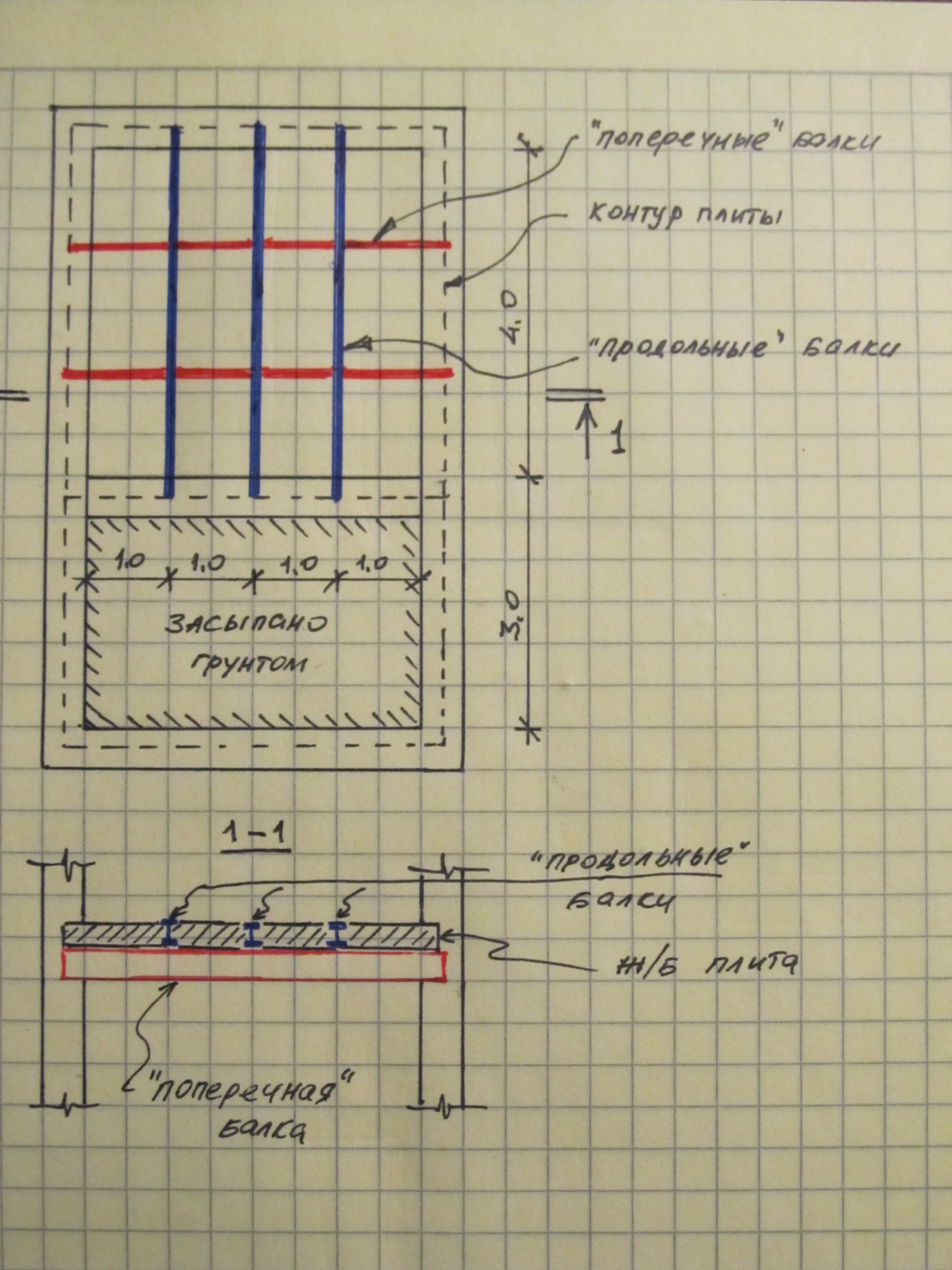 Учитывая почтенный возраст конструкции и то, что видно на фотографиях, рискну предположить, что т.н. "продольные" балки - это б/у рельсы. В любом случае, для хоть какого-то предметного разговора Вам понадобятся следующее: 1) расстояние между стенами в обоих направлениях; 2) шаг балок и расстояние от крайних балок до стен; 3) вид профиля (двутавр, швеллер, рельс), высота сечения балок и ширина полки (желательно с точностью до миллиметра); 4) толщина ж/б плиты; 5) примерная схема стоянки а/м в гараже; 6) максимально информативные фотографии балок и плиты, их состояния (коррозия). Если плита покрыта трещинами - то нужно знать где они, как направлены, ширину трещин, сквозные ли... и т.д. И всё равно, "за кадром" останется армирование (класс арматуры, диаметр, шаг) и класс бетона. Эти переменные придется принимать строго "на глаз" и руководствуясь интуицией (конечно, при желании можно заказать обследование конструкций в специализированной организации, которая тогда выдаст и недостающие сведения).