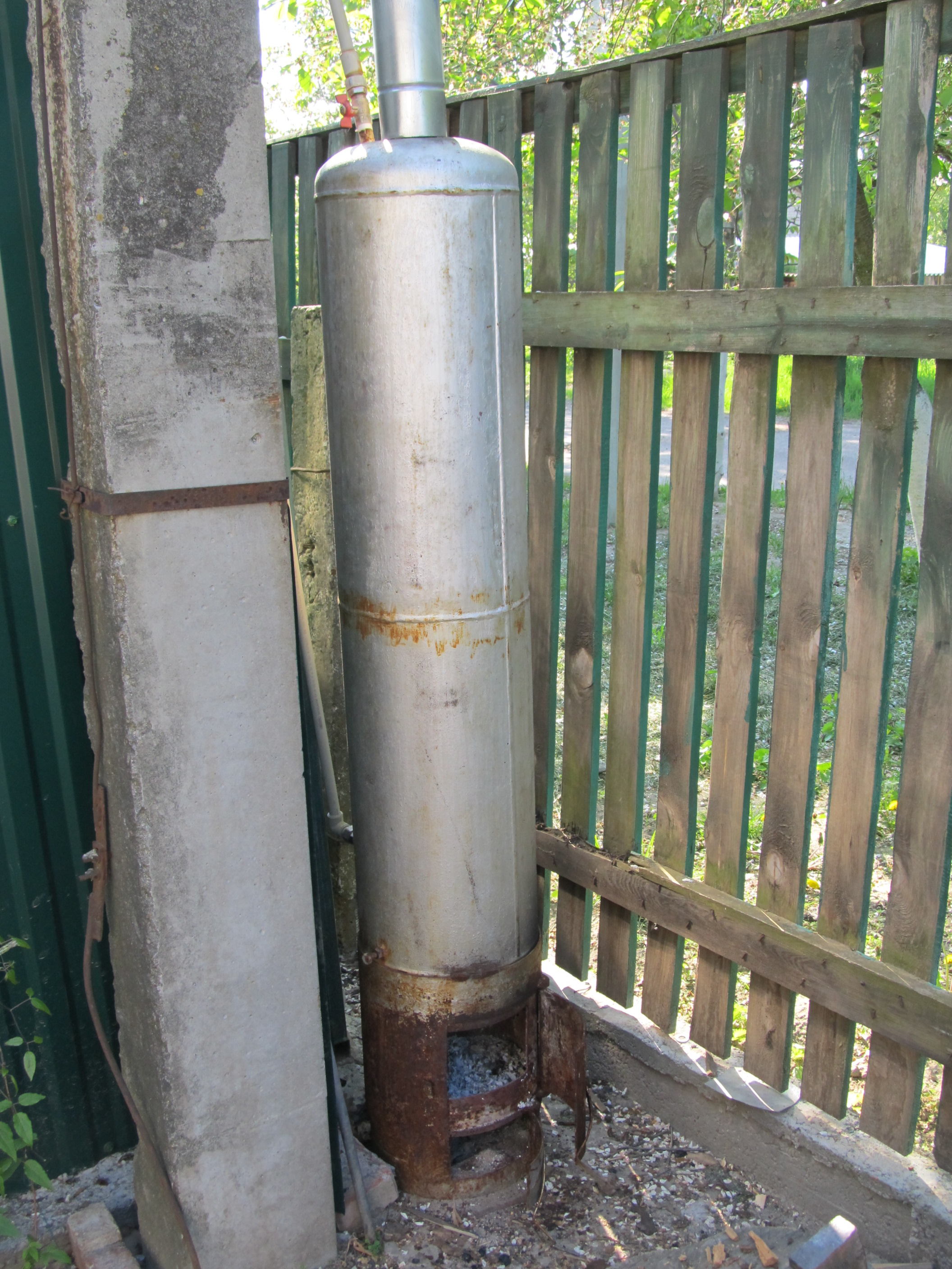 Искать по словам "колонка дровяная водогрейная". Навскидку - вот . Это если заводской. А так - к любому сварщику. Можно и самому. Понадобится 3 газовых баллона, приобретенных в чермете, ок. 2х метров трубы d100, четверть квадрата листового металла t3, 3 штуцера на 1/2", мелочевка типа болтиков/гаечек, труба из оцинковки и зонтик для дымохода. Только обязательно ознакомиться с тем, как вскрывают баллоны.