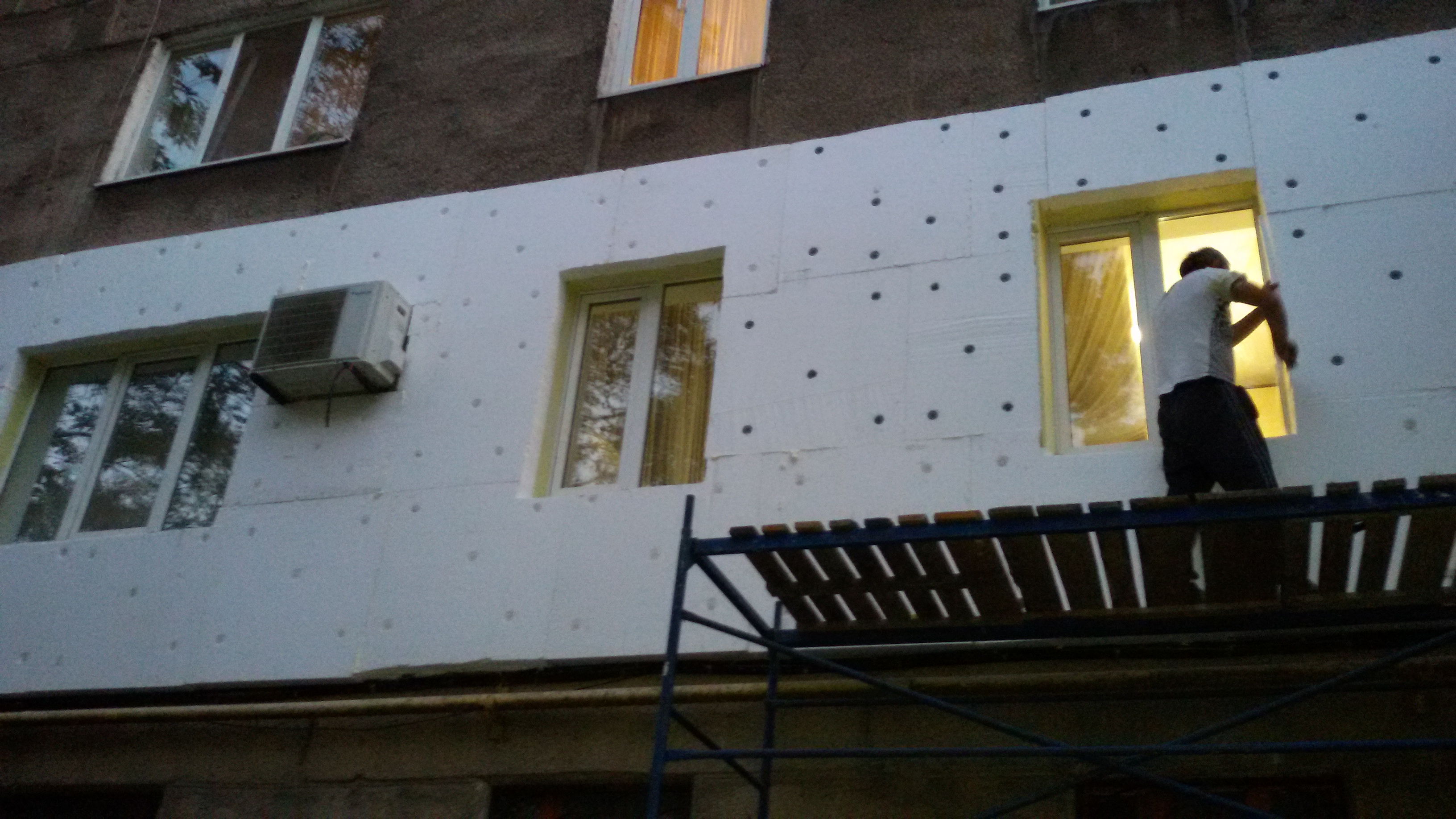 Привет всем. Сегодня поехал с утра забрал леса строительные, их мне одолжили вместе с Газельвагеном. Загрузил пенопласт, ну поехал как и обещал утеплять квартиру. За день успели приклеить и прибить пенопласт. Завтра ожидает приклейка сетки и черновой фасад и карнизы. Ну а на следующих выходных уже декоративная отделка и покраска. Утеплял ПБС-25 100 мм, крепил на пену из балончика и 160 мм дюбеля. Откосы пенополистирол 20 мм. Почему он? Да потому, что остался после ремонта в квартире и утепления балкона. Работали вдвоём, пару раз еще брат по часику помогал. Вышло б быстрее, если б не приходилось бы переставлять строительные леса три раза, ну и пару раз зависали с подгонкой ПБС, т.к. в некоторых местах ж/б блоки из которых построен дом, были мягко говоря кривые и с выступами до 5 см на стыках.