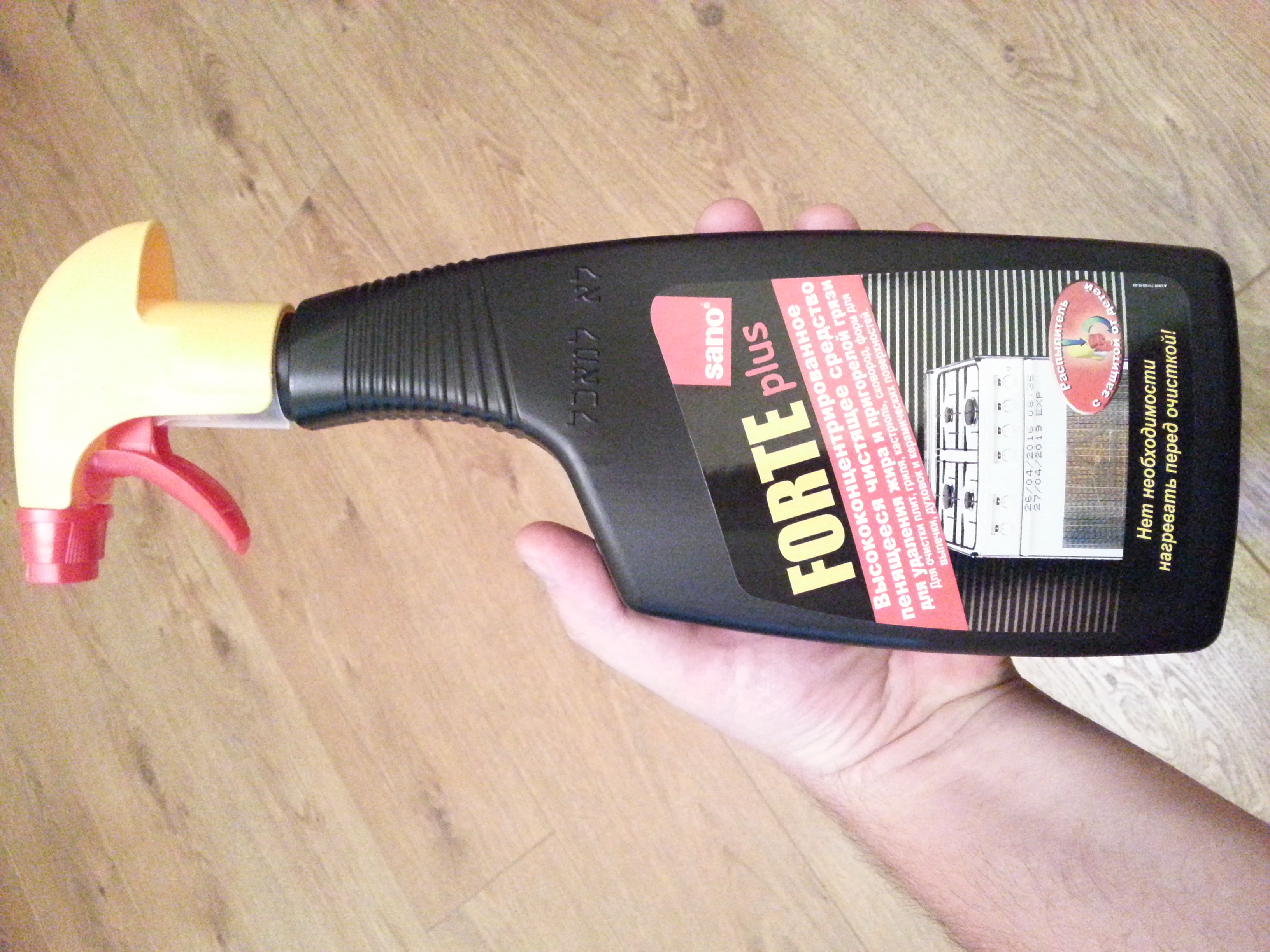 Кухонное моещее средство (типа мистер мускул для кухни) + мочалка