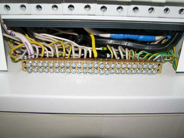 Чисто для интереса - вот так выполнен шиток (фальшпанель я снял) и проводка в буквально в этом году построенной немецкой квартире. Сделана немецким электриком по немецким же нормам. Шиток Hager, в квартиру входит три фазы 6 или 10 квадратов, не помню точно. Ессно, все медь. Проводка выполнена одножильным проводом 1,5 квадрата с использованием вот тех самых Ваго клемников из моего поста выше. Автоматы на 16А, характеристика B. Для плиты и кондиционеров сечение побольше. Шины для нулевых и нейтральных проводников сами видите - частично в виде cage clamp, большее сечение зажимается под винт. Одну такую шину я специально разобрал и сфоткал.