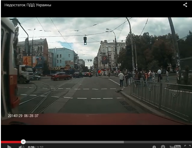 Для невнимательных поясню. Мы видим загоревшийся зеленый, при этом в перпендикулярном направлении самосвал только-только выезжает на перекресток. Нет, он не не успел завершить его проезд, он сознательно выехал на желто-крысный, или вовсе красный сигнал своего светофора, выехал на минимальной скорости, и ускоряться уже на трамвайных путях начал. Т.е. перед нами обычное хамоватое спешащее быдло ложившее на всех, но за рулем грузовика. Оно выехало, и заблокировало движение на целом перекрестке. Но по логике Адвоката, оно не виноватое. Потому что оно ж за рулем. Виноваты как обычно злобные пешеходы.